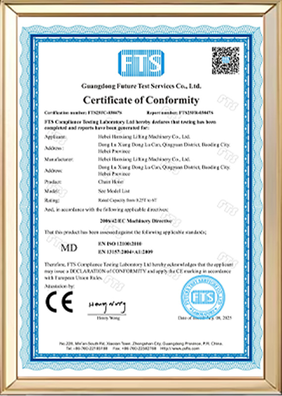 Founded in August 1997 in Donglv Village, Qingyuan County, Baoding, Hebei Province, a major industrial base in China, Hanxiang Lifting Machinery Co., Ltd. The factory covers an area of over 3,000 square meters and boasts 28 years of industry experience. It possesses over 200 sets of machinery and equipment for forging, heat treatment, stamping, hydraulics, and machining, as well as products such as universal material testing machines, servo fatigue testing machines, and electromagnetic eddy current flaw detectors. The company is equipped with over 500 testing devices, professional production technology, and a comprehensive scientific management and quality control system.